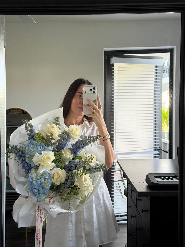 White roses and sky-blue hydrangeas in one bouquet — purity and elegance wrapped as a gift.