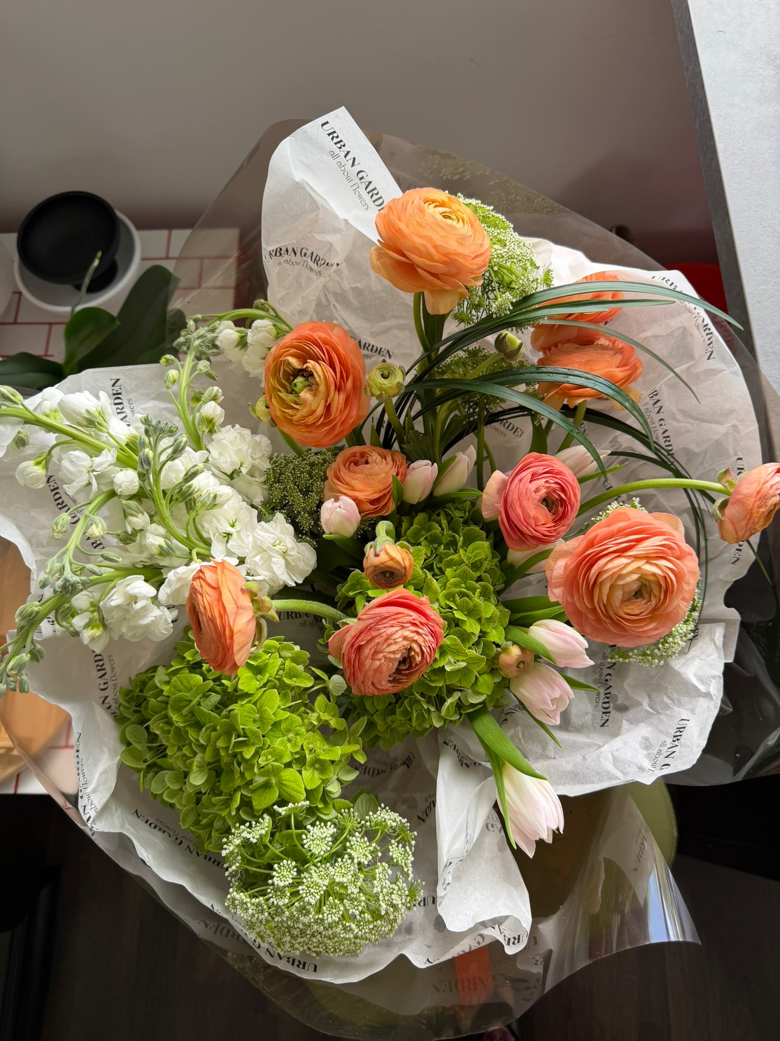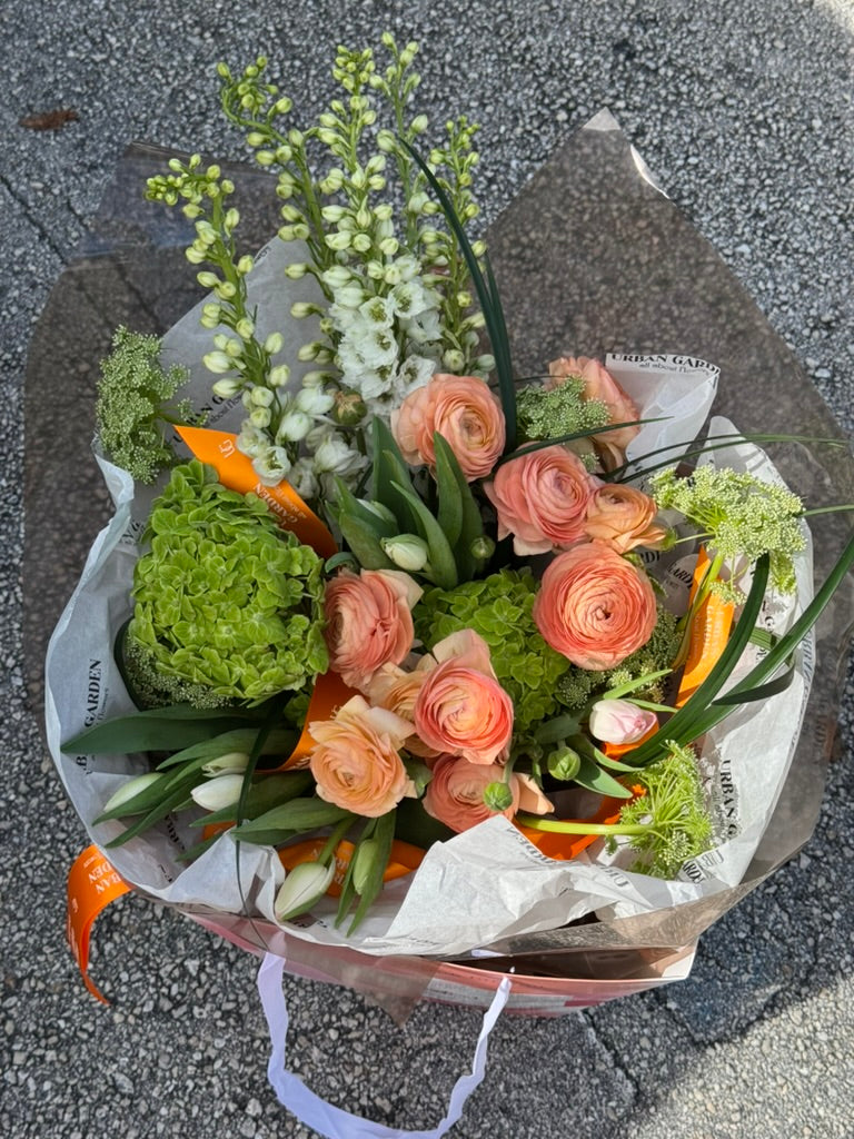 A graceful and joyful arrangement that captures the essence of springtime. This bouquet features delicate ranunculus, elegant tulips, lush green hydrangea, and soft white stock — all wrapped in premium tissue and finished with our signature Urban Garden ribbon. Perfect for Mother’s Day, birthdays, or simply to brighten someone’s day.