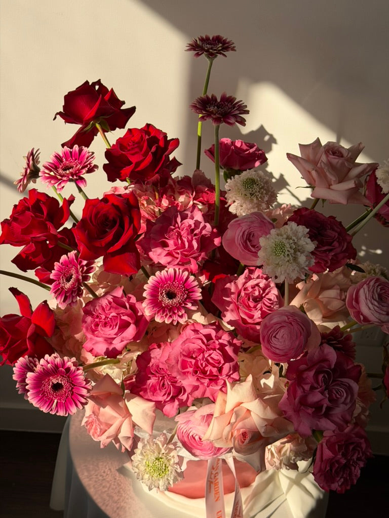 Garden roses, ranunculus, gerberas and delicate accent blooms are layered to create a lush, modern composition with a light, sculptural feel. Designed to feel feminine, expressive and refined — without heaviness or excess.