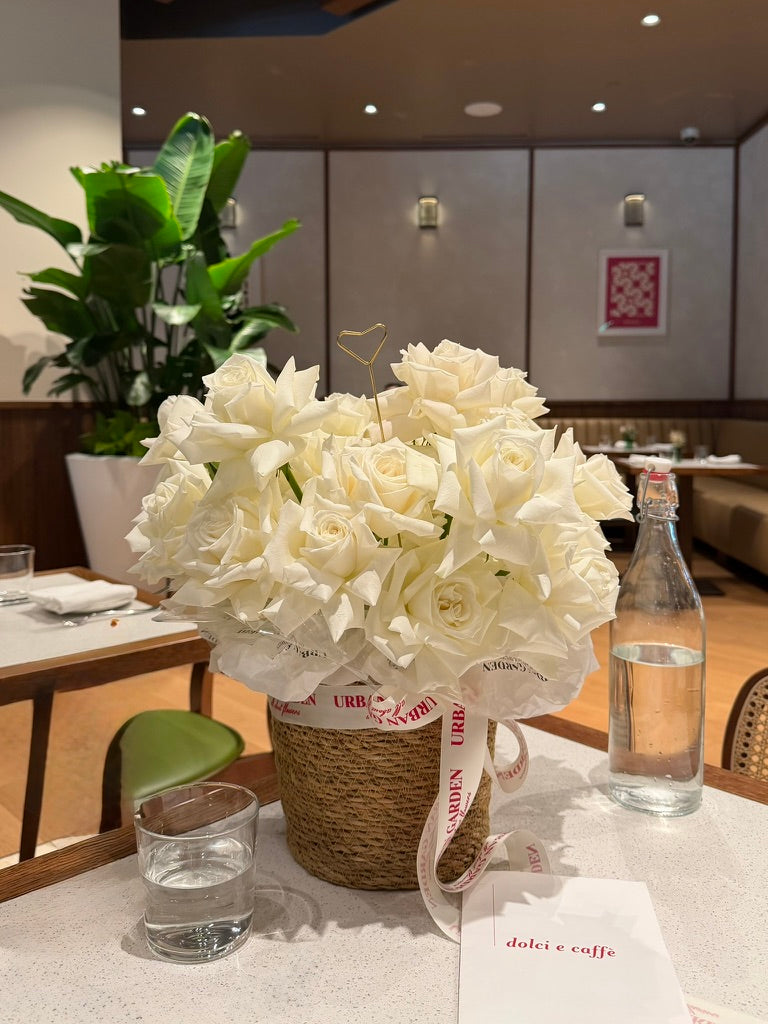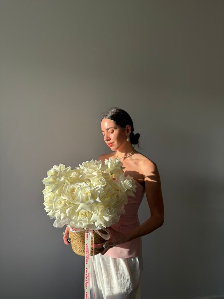 A timeless arrangement of pristine white roses presented in a stylish basket. Symbol of purity and elegance, perfect for weddings, anniversaries, or meaningful occasions.