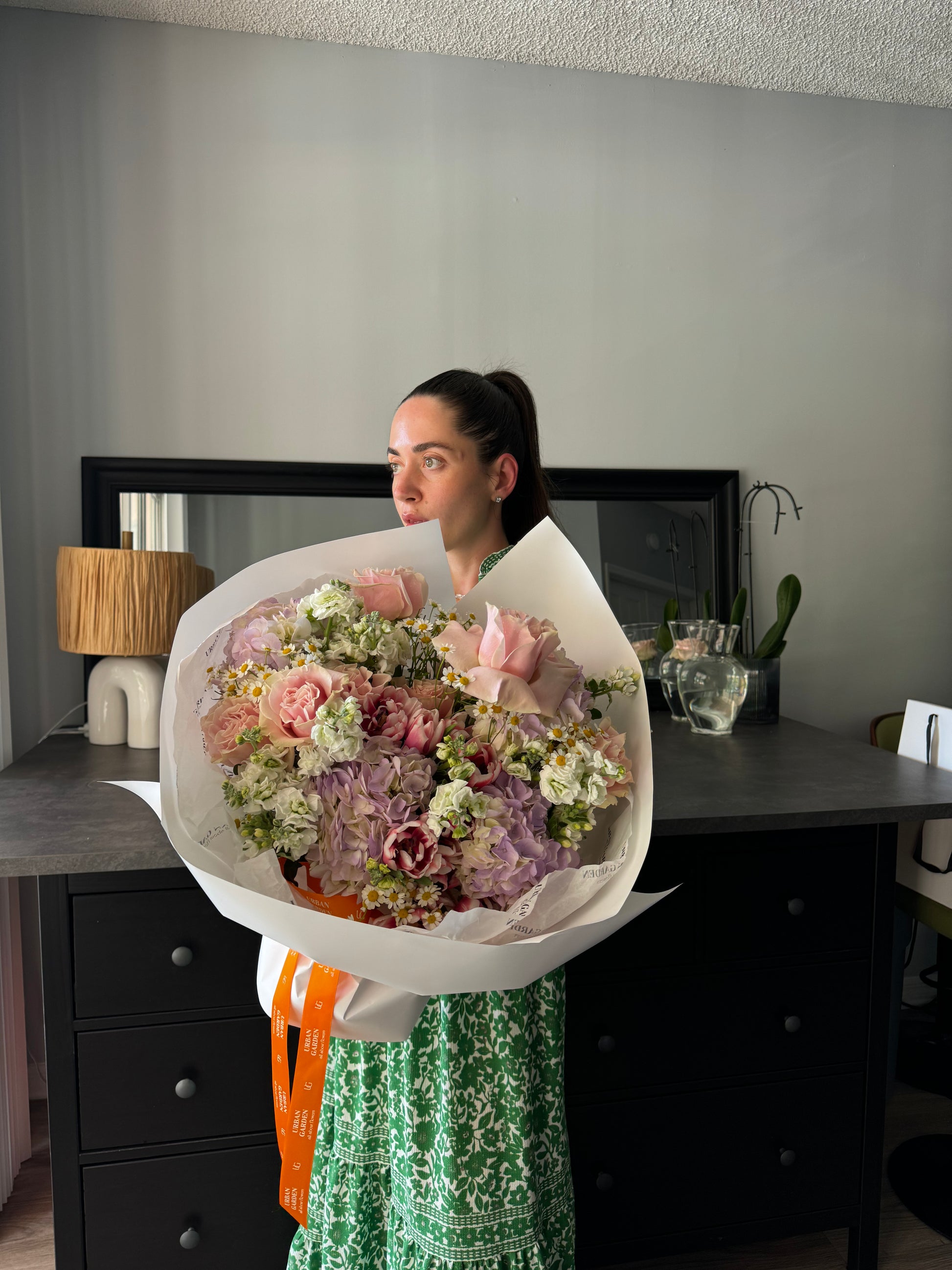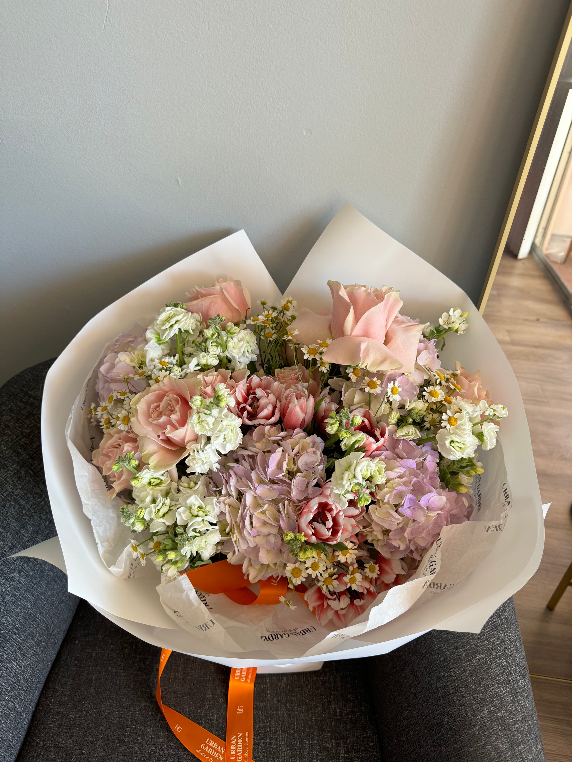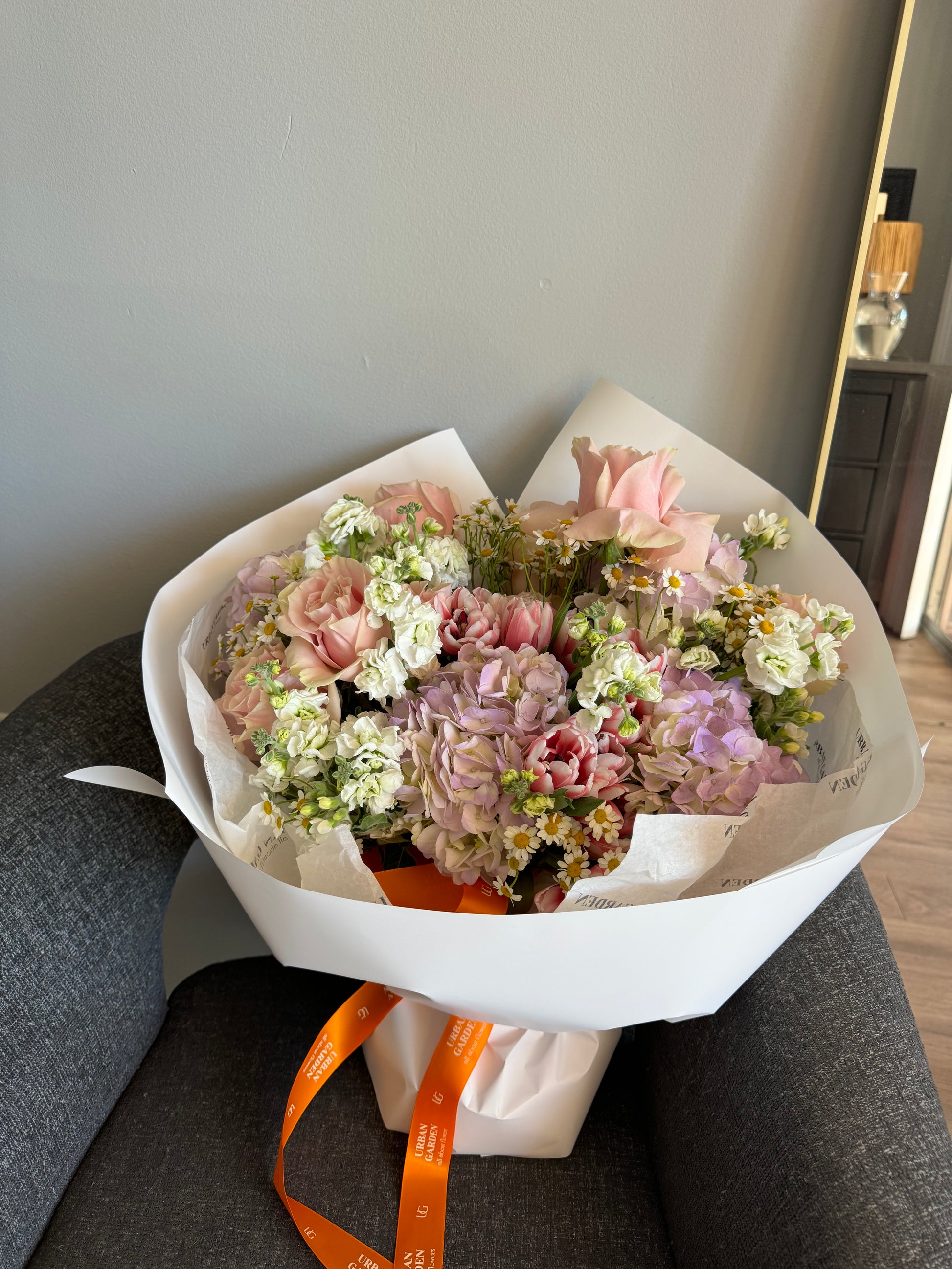 It is important to keep in mind that this is a reference image of your bouquet. Whilst you can expect similar colours and styling, Urban Garden cannot guarantee the exact florals used in this arrangement. Furthermore, flowers are subject to change due to seasonal availability.